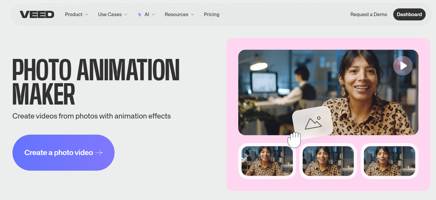 VEED is an all-in-one video editor that includes AI tools to animate images and add dynamic effects. With VEED, you can upload a picture, apply voiceover or subtitles, and turn it into a short talking video using AI avatars or animated templates. The interface is beginner-friendly, and the free version covers most basic animation needs for creators, educators, and marketers.
